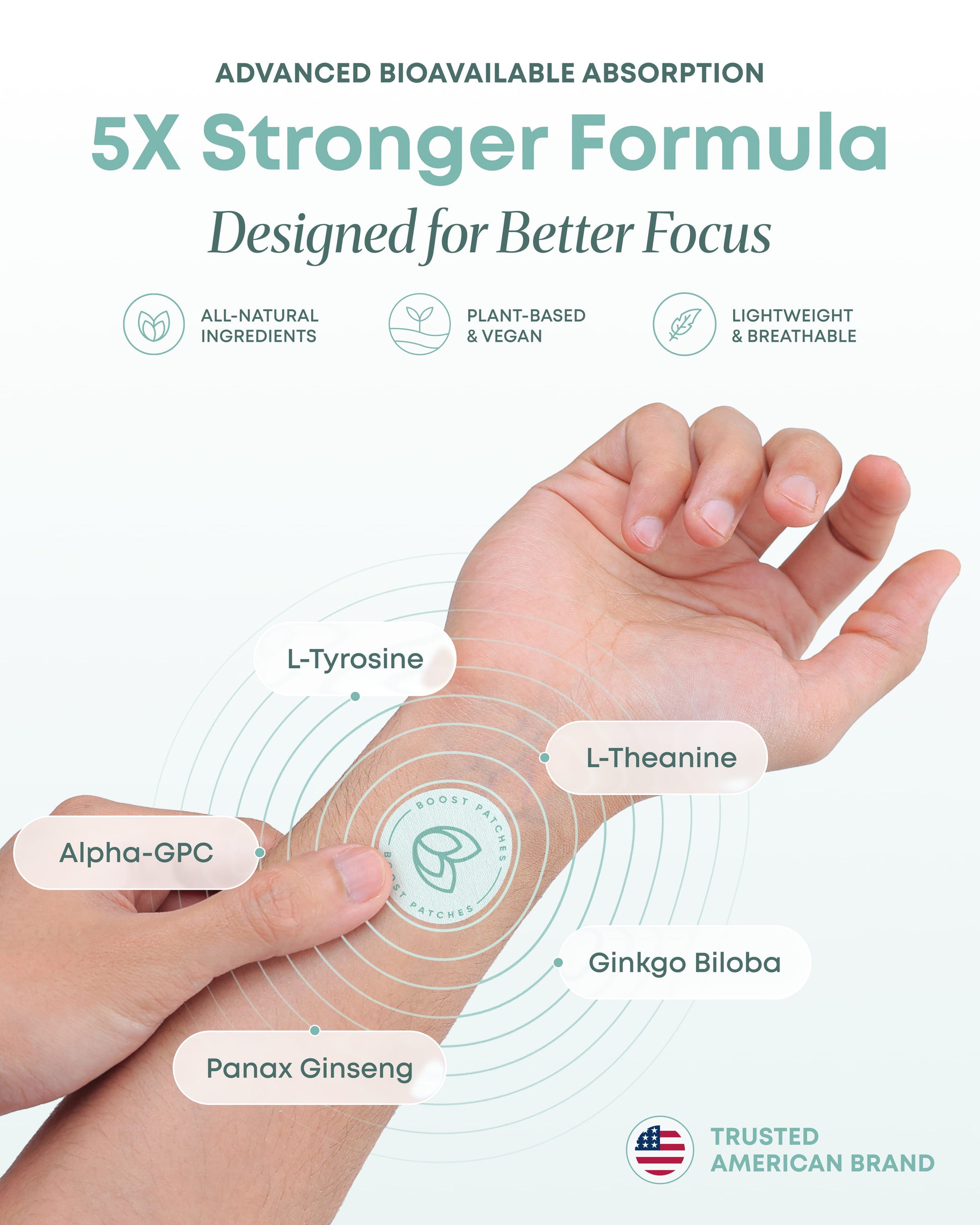 - 5X FORMULA: Focus patches combine L-tyrosine, L-theanine, ginkgo biloba, panax ginseng, caffeine, Bacopa monnieri and B12 in one chemistry-driven formula crafted for daily focus and clarity.