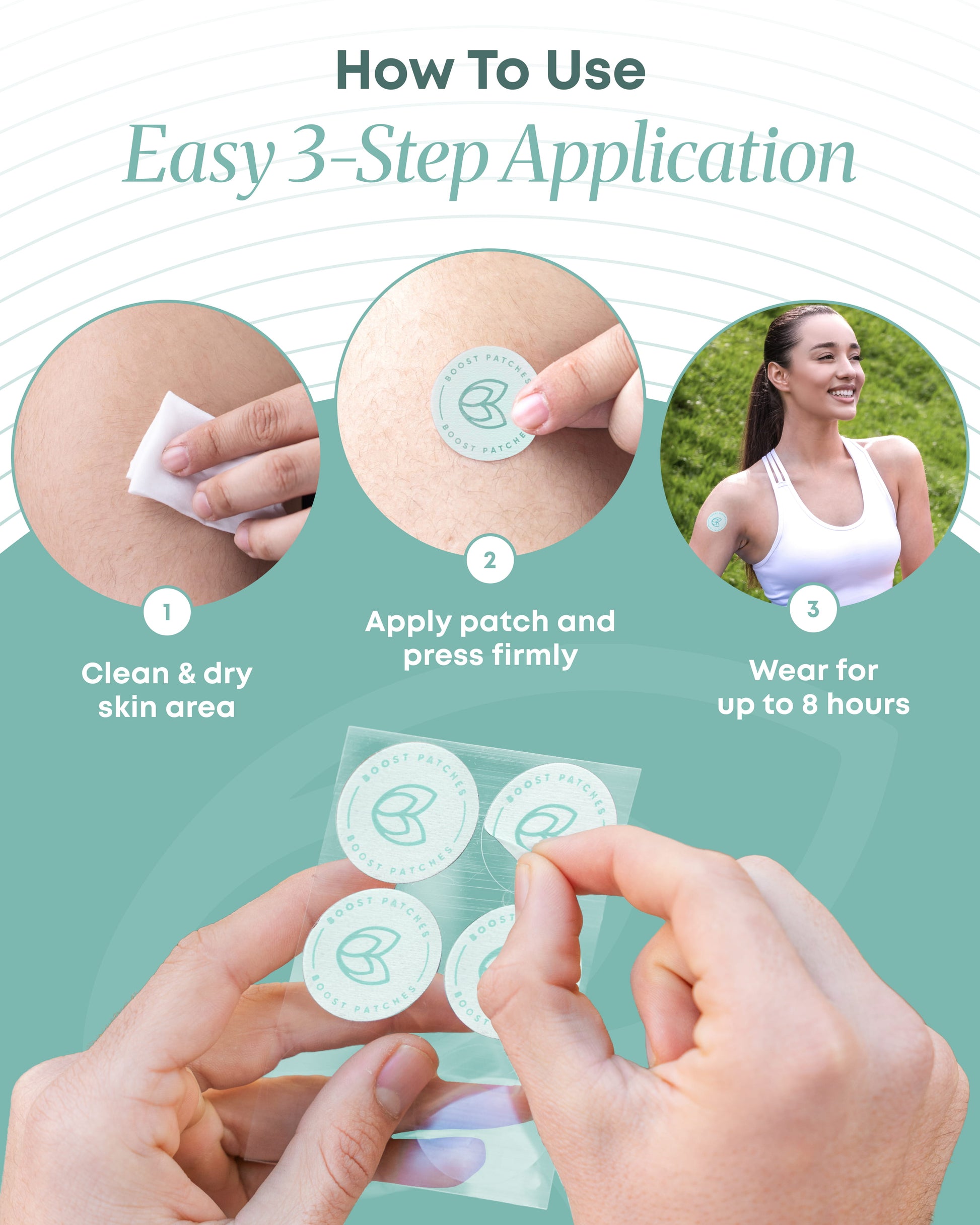 Applying Boost Patches is simple and easy to do. Simply peel the sticker and apply to your wrist or any venious are of your body. Our slow-release formula will begin to work immediately.