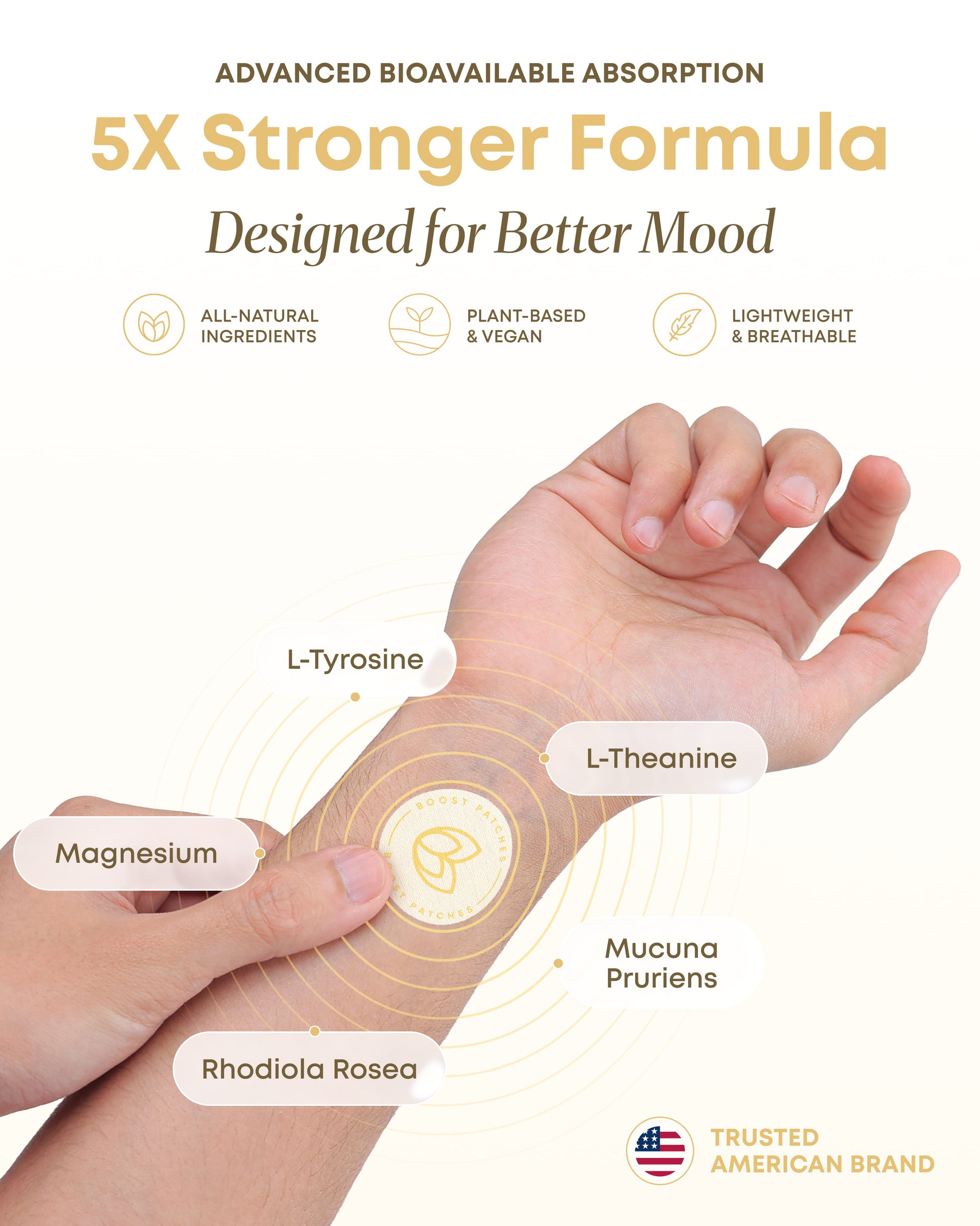 • 5X FORMULA: Mood patches combine Mucuna Pruriens, L-Tyrosine, Rhodiola Rosea, L-Theanine, and 5-HTP in one chemistry-driven formula crafted for daily mood support.